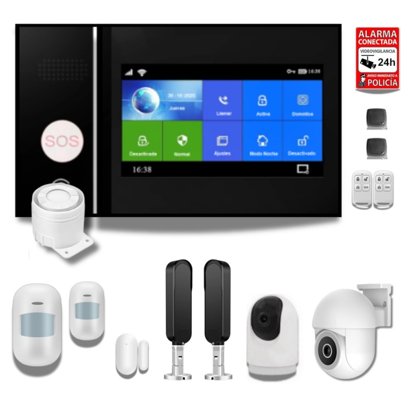Tipo de aviso alarma en segundos: Llamada a 5 números, SMS, mensaje a la APP, envío de fotos, vídeo online de la propiedad (con cámaras) y sirena.