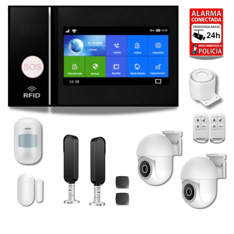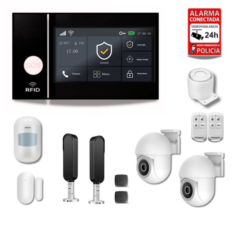 Tipo de aviso alarma en segundos: Llamada a 5 números, SMS, mensaje a la APP, envío de fotos, vídeo online de la propiedad (con cámaras) y sirena.
