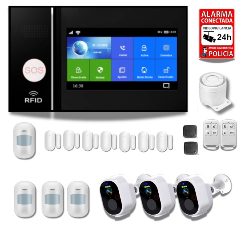 - Tipo de aviso alarma en segundos: Llamada a 5 números, SMS, mensaje a la APP, envío de fotos, vídeo online de la propiedad (con cámaras) y sirena.