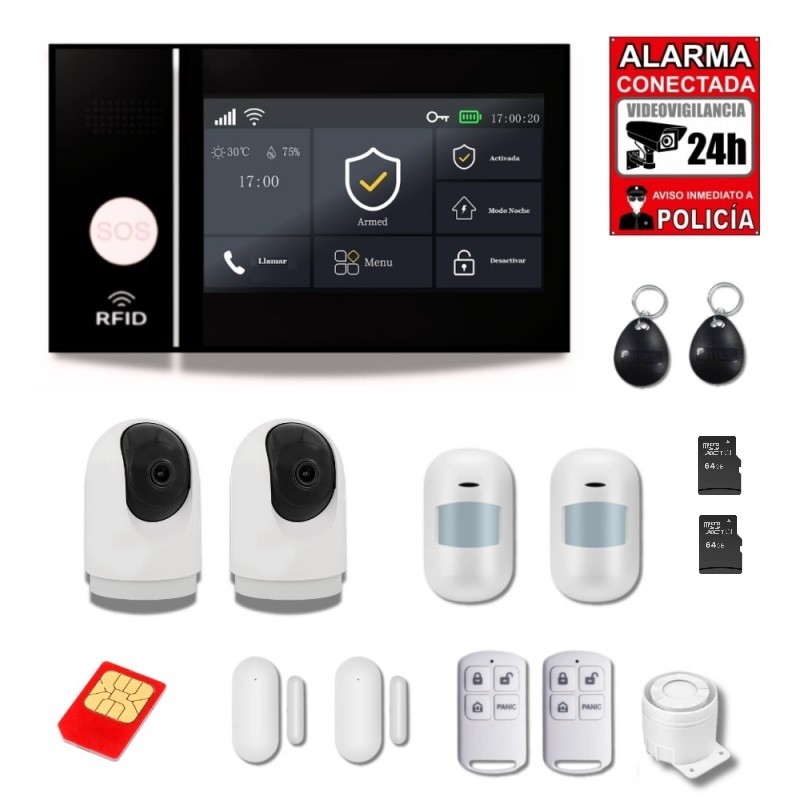 - Tipo de aviso alarma en segundos: Llamada a 5 números, SMS, mensaje a la APP, envío de fotos, vídeo online de la propiedad (con cámaras) y sirena.